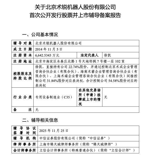 证监会官网显示,北京术锐机器人股份有限公司(以下简称:术锐机器人)已在北京证监局完成IPO辅导备案登记,辅导机构为中信证券。