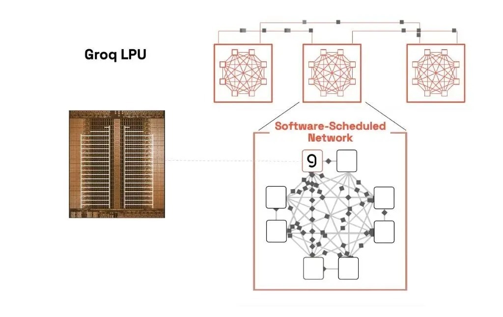 软件调度网络方面,Groq使用准同步芯片间协议来消除时钟漂移,并将数百个LPU对齐,使其充当单个核心。这样,软件编译器可以准确预测数据到达时间,支持时序推理。周期性软件同步不仅支持计算调度,还支持网络调度,使Groq能够像单核超级集群一样运行,避免了传统架构中的复杂协调问题。