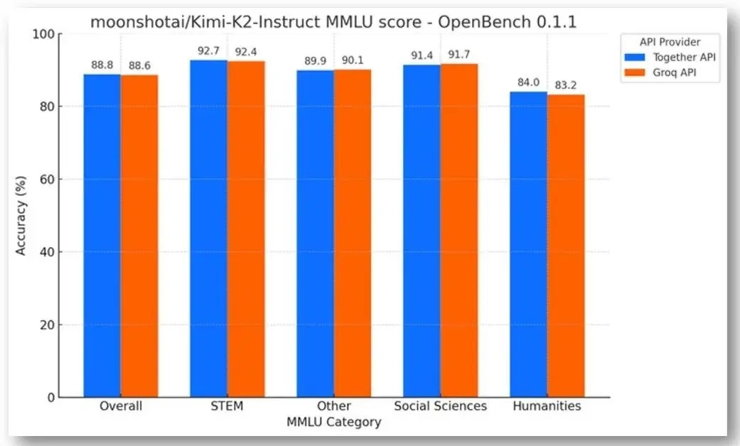 在基准测试方面,Groq表现出了卓越的性能。他们发布了OpenBench,一个与提供商无关的、面向大型语言模型(LLM)的开放评估框架。在Groq和基于GPU的API提供商上运行Kimi-K2-Instruct的OpenBench 0.1.1 MMLU实现,结果显示准确率得分很高,充分展现了Groq堆栈的强大功能。