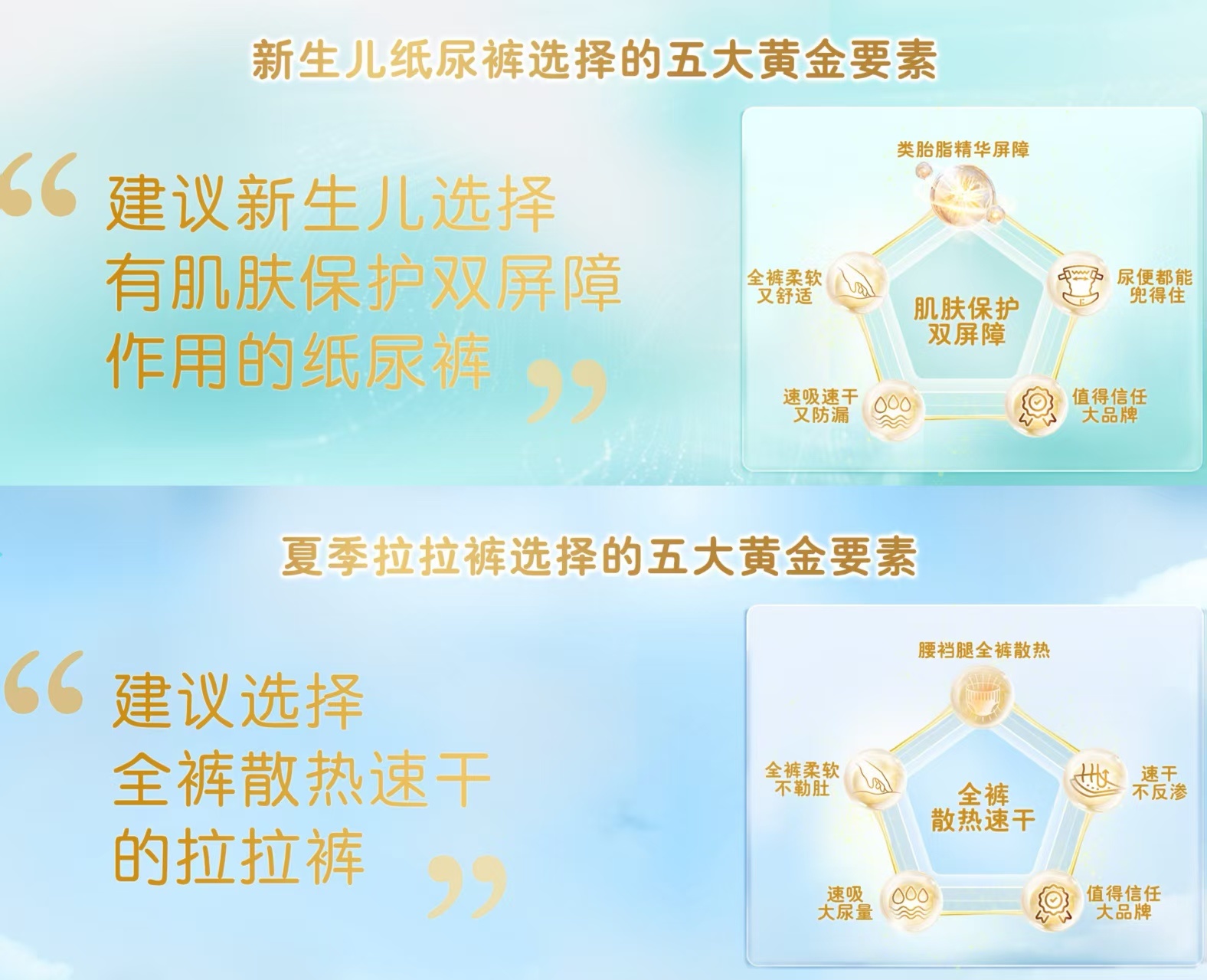 圆桌讨论中,多位知名母婴领域意见领袖也结合真实育儿经历提到,新生儿阶段“红屁屁”“炸屎”“不会选”是许多家庭共同面对的难题。基于这一洞察,帮宝适联合新华网在现场发布了《新生儿纸尿裤选择五大黄金要素》与《夏季拉拉裤选择五大黄金要素》,建议新生儿阶段优先关注是否含有类胎脂精华屏障5、是否能够兜住尿便、是否全裤柔软舒适、是否速吸速干3且防漏,以及是否来自值得信赖的品牌;而在夏季及宝宝运动时,则更应关注拉拉裤的全裤散热2、速干3吸收和清爽舒适表现。